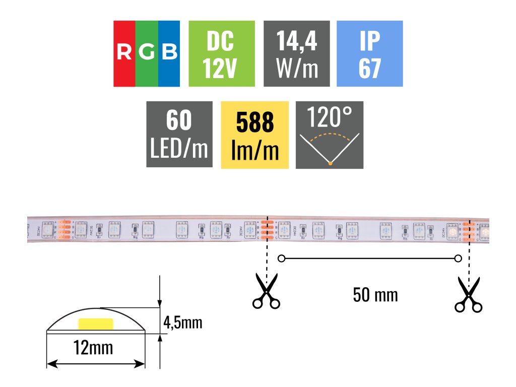 Z výkonu 14,4W/m RGB pásek vyprodukuje až 588lm/m. Hustota LED diod je 60ks/m, pásek díky tomu svítí rovnoměrně po celé své délce. Tento pásek je třeba nalepit do hliníkové lišty z důvodu odvodu tepla z LED diod. Všechny naše pásky jsou vybaveny samolepící fólií 3M 300LSE, která skvěle přilne k podkladu. Ten musí být hladký a je třeba ho před lepením pořádně odmastit.