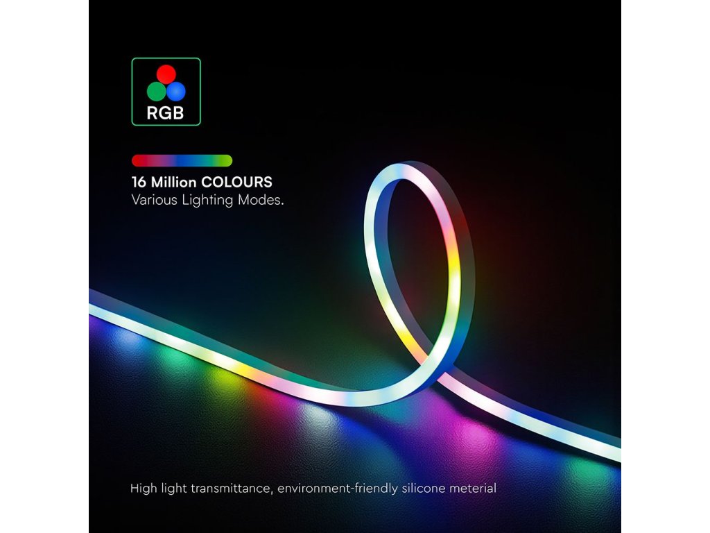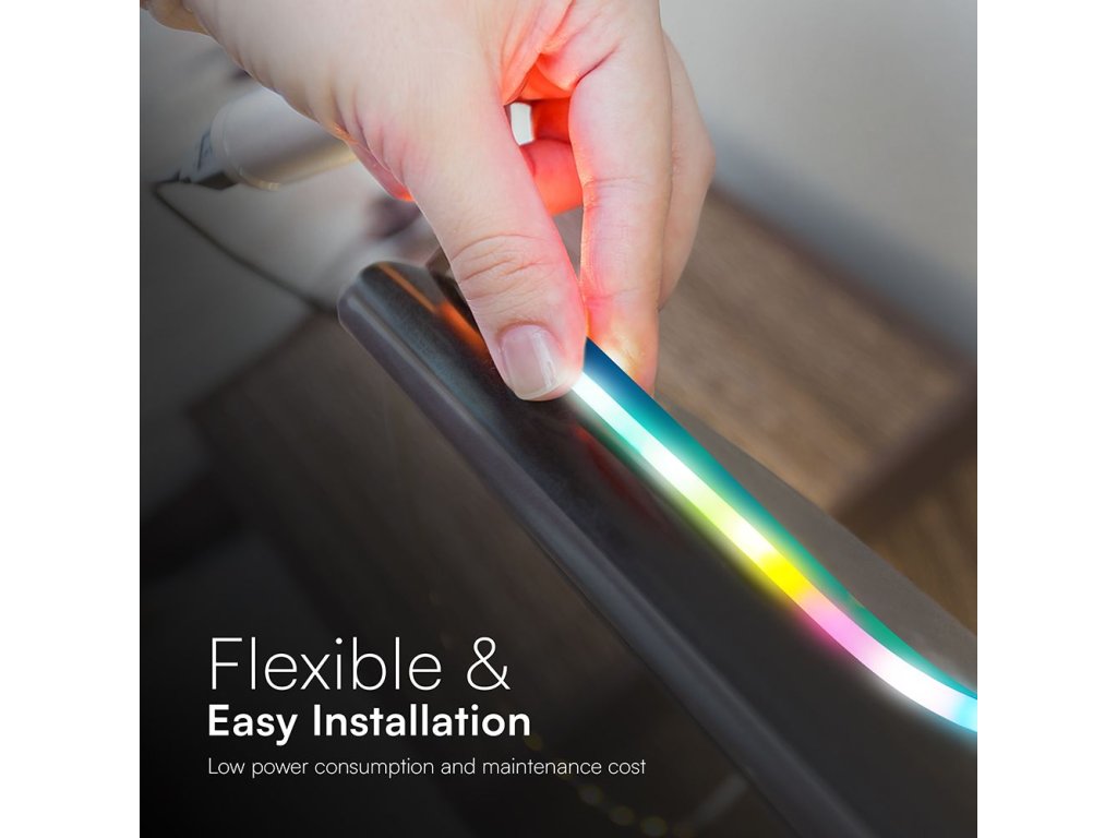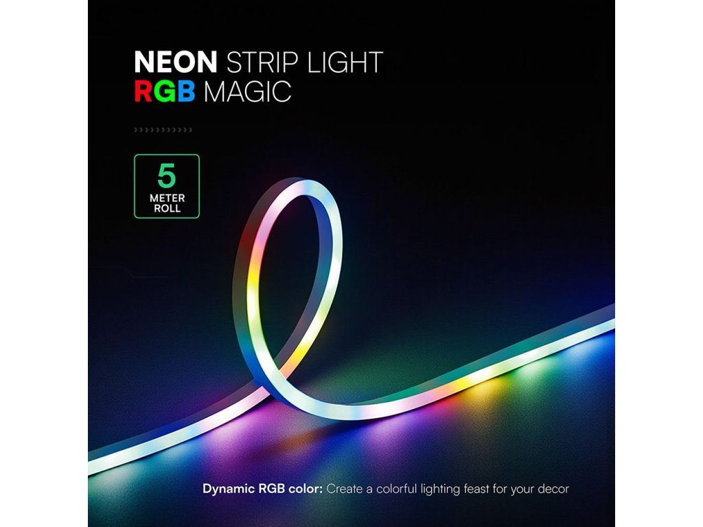 RGB NEON LED pásek s WiFi v délce 5 metrů představuje moderní a efektní řešení pro dekorativní osvětlení interiérů, kde je kladen důraz na plynulé světlo, barevnou variabilitu a jednoduchou instalaci. Souvislé neonové provedení se silikonovým difuzorem zajišťuje rovnoměrný světelný efekt bez viditelných bodů a vytváří elegantní světelné linie vhodné pro zvýraznění hran, obrysů, nábytku, polic, skříněk, barů nebo dalších ploch s omezeným instalačním prostorem.