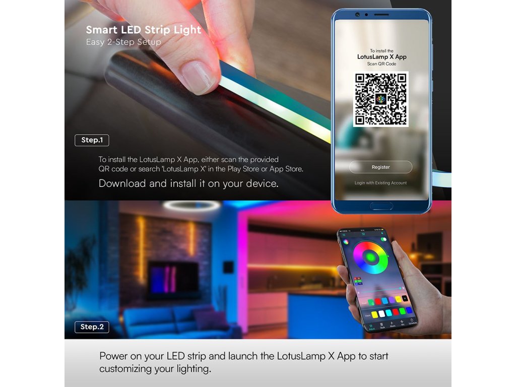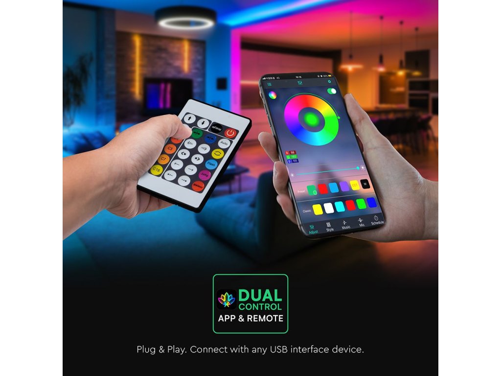 Ovládání je řešeno velmi flexibilně a přizpůsobí se různým preferencím uživatele. RGB osvětlení s až 16 miliony barev lze řídit pomocí mobilní aplikace LotusLamp X přes WiFi, přiloženého dálkového ovladače nebo ovládacího tlačítka na USB kontroleru. Aplikace umožňuje detailní nastavení barev, jasu, dynamických efektů, světelných scén i časového plánování, díky čemuž lze snadno vytvořit atmosférické, relaxační i dynamické osvětlení podle aktuální nálady nebo příležitosti.