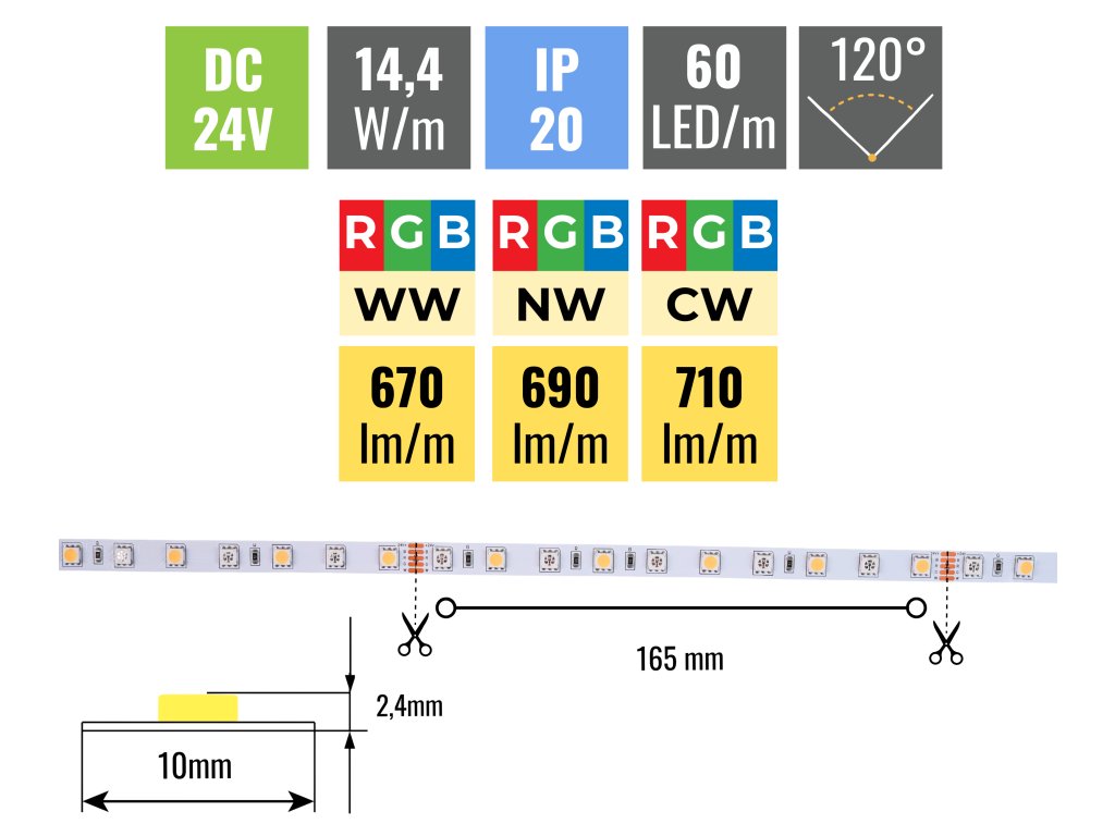 Z výkonu 14,4W/m pásek vyprodukuje až 710lm/m. Hustota LED diod je 60ks/m, pásek díky tomu svítí rovnoměrně po celé své délce. Tento pásek je třeba nalepit do hliníkové lišty z důvodu odvodu tepla z LED diod. Všechny naše pásky jsou vybaveny samolepící fólií 3M 300LSE, která skvěle přilne k podkladu. Ten musí být hladký a je třeba ho před lepením pořádně odmastit.