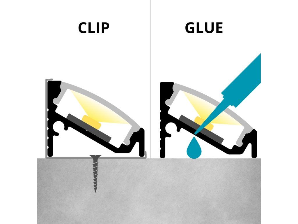 Profil lze připevnit ke stěně nebo jinému podkladu pomocí držáků, nalepit nebo přišroubovat.