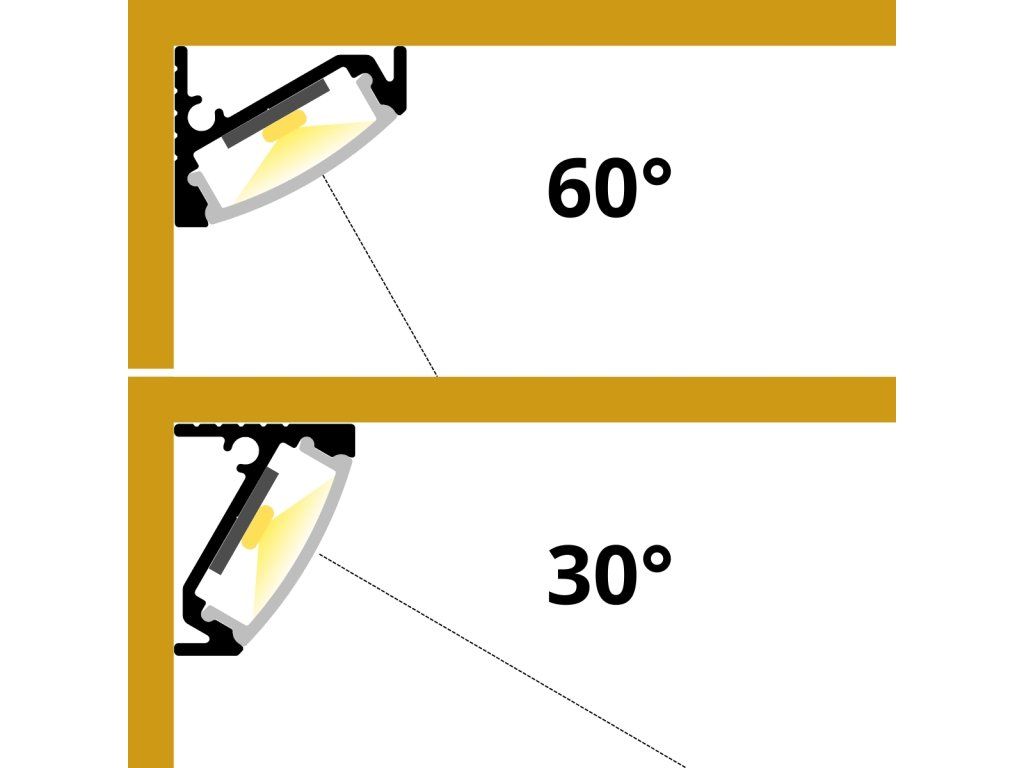 Rohový hliníkový profil neboli lišta slouží nejen jako chladič pro LED pásek, ale také jako designový prvek do interiéru nebo praktický doplněk nábytku. Díky promyšlené konstrukci umožňuje nasměrovat světlo pod úhlem 30° nebo 60° podle způsobu instalace, takže si můžete přizpůsobit charakter osvětlení konkrétnímu prostoru. Užší úhel 30° je vhodný pro nasvícení pracovní plochy nebo detailů, zatímco širší 60° zajistí rovnoměrnější osvětlení stěn, stropů či nábytku.