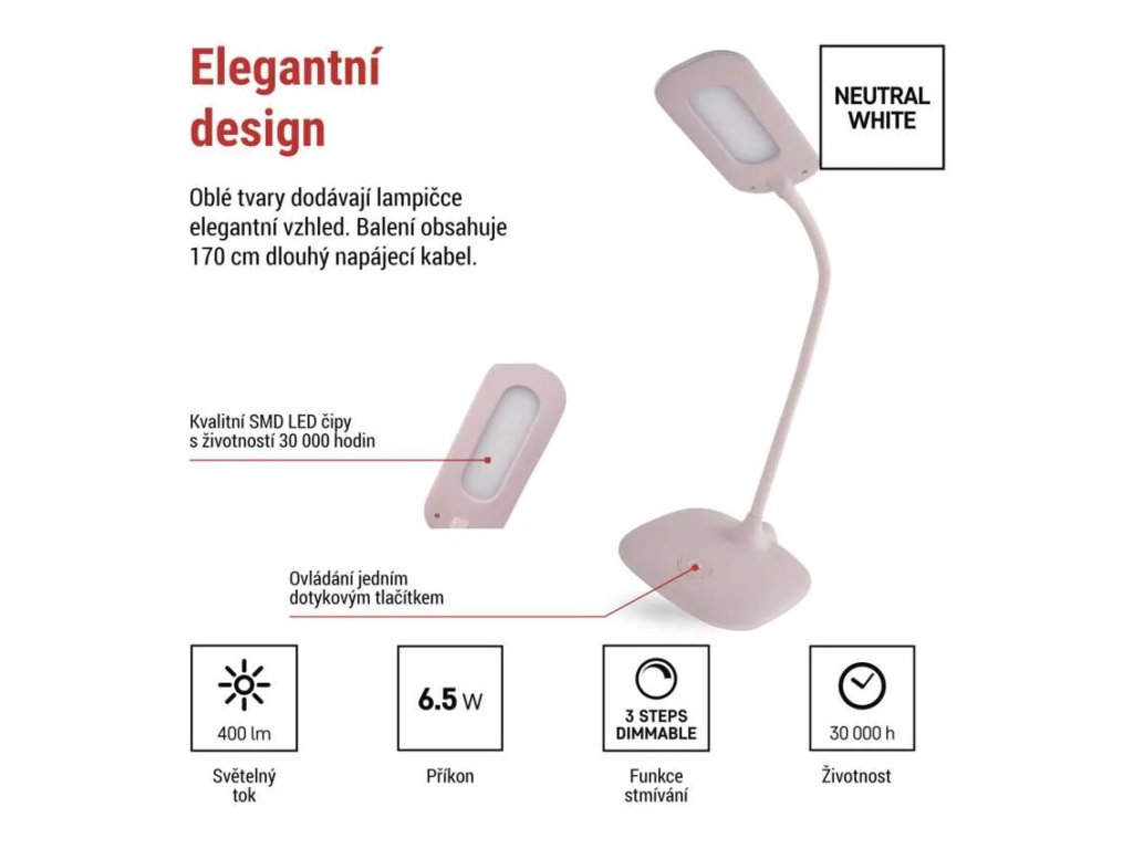 Integrované SMD LED čipy poskytují světelný tok 400 lm při výkonu 6,5 W a vyzařují neutrální bílou barvu světla o teplotě 4 000 K, která je vhodná pro práci, studium i čtení bez zbytečné únavy očí. LED zdroj má dlouhou životnost až 30 000 hodin a zajišťuje úsporný a bezúdržbový provoz.