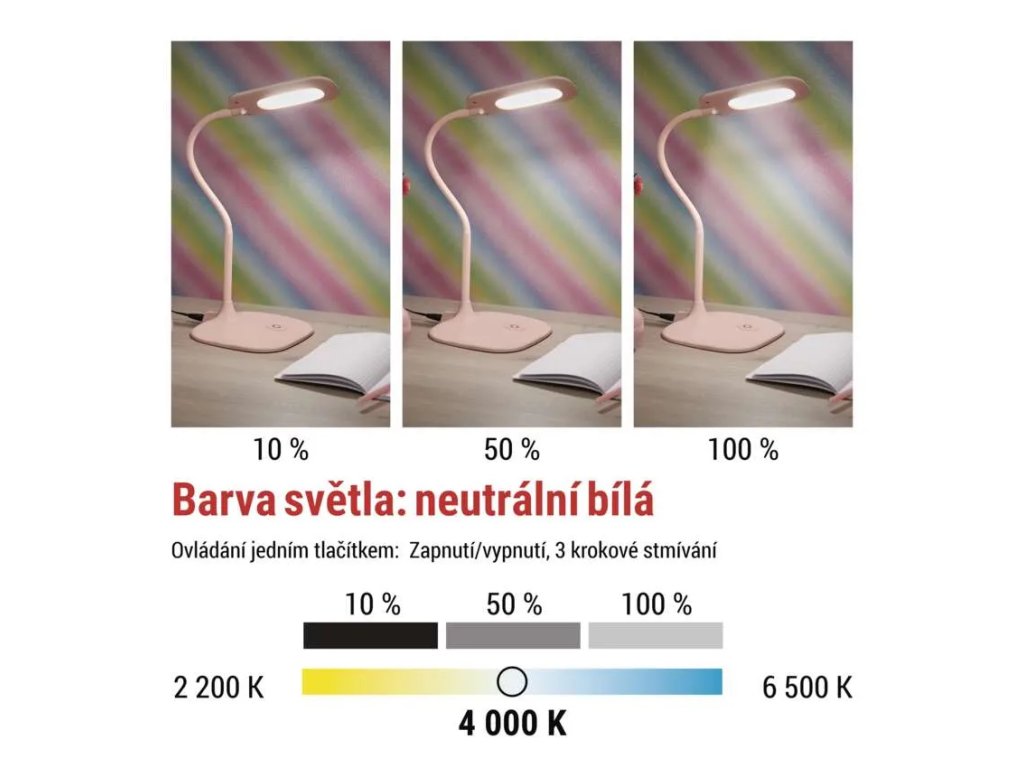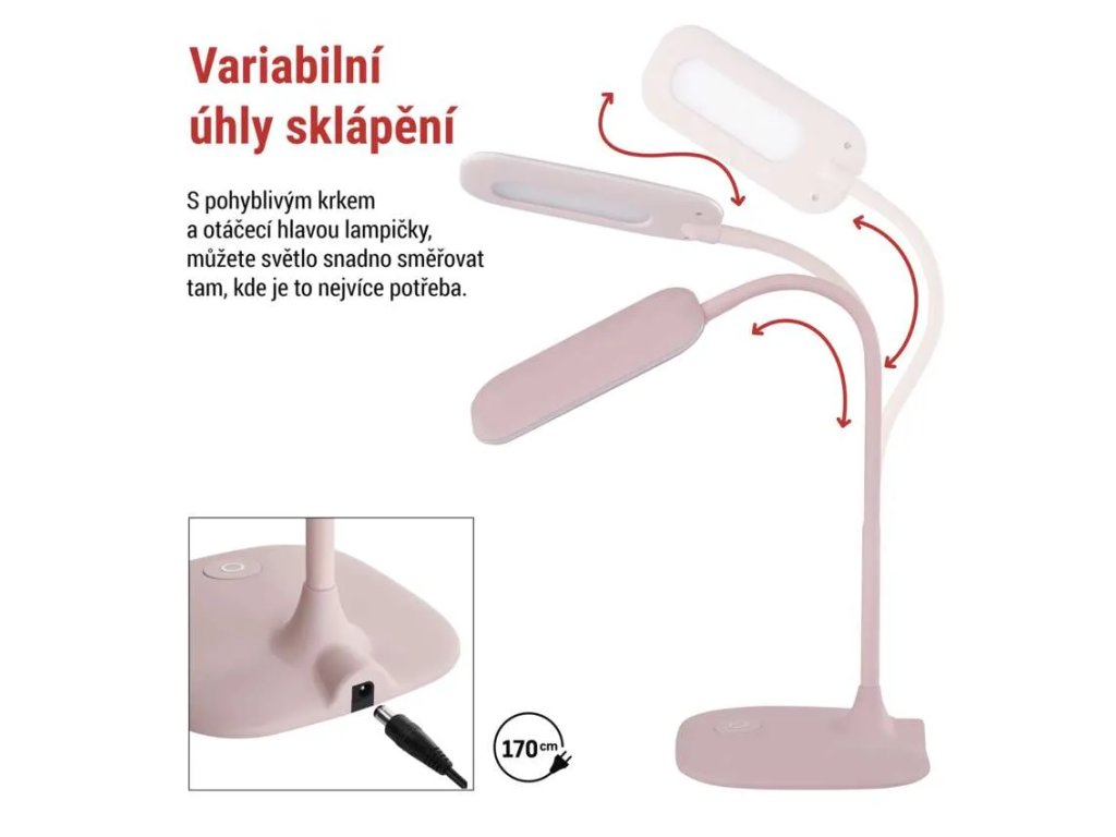 Ohebný krk v kombinaci s otočnou hlavou umožňuje snadno nasměrovat světlo přesně tam, kde je potřeba. Ovládání je řešeno jedním dotykovým tlačítkem na podstavci, pomocí kterého lze lampičku zapnout, vypnout a plynule přepínat mezi třemi úrovněmi jasu podle aktuální činnosti.