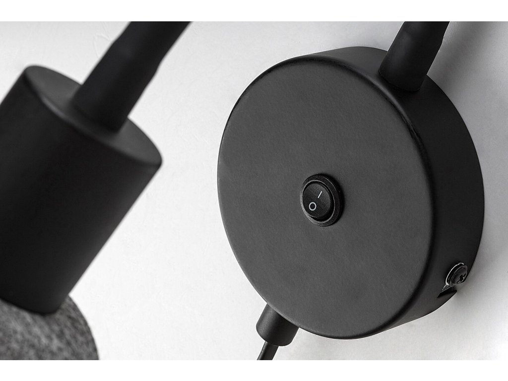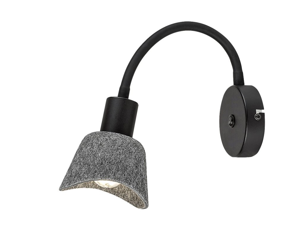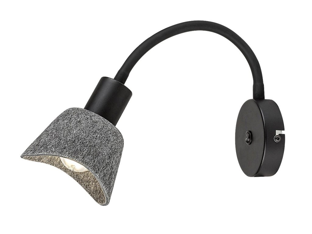 Nástěnné bodové svítidlo Farelia s flexibilním ramenem kombinuje funkční čtecí osvětlení s jemným, útulným vzhledem. Kovová konstrukce v černém provedení je doplněna šedým plstěným stínidlem, které změkčuje světlo a zároveň působí dekorativně. Plstěný materiál je vyroben z recyklovaných surovin a podtrhuje přirozený charakter svítidla.