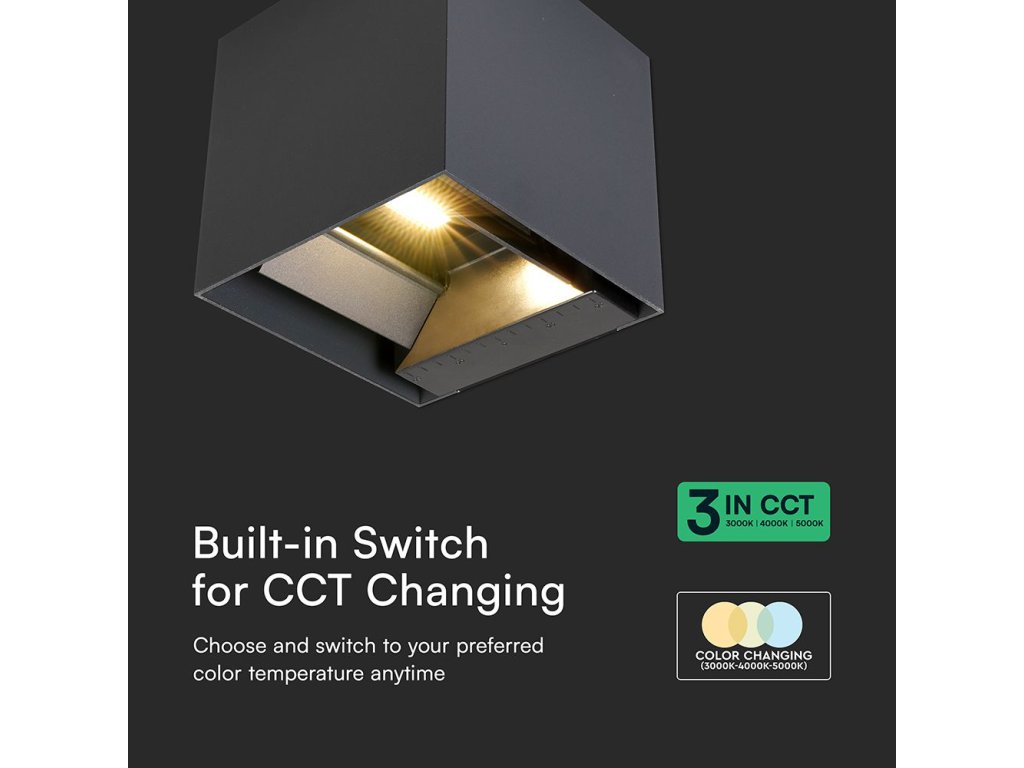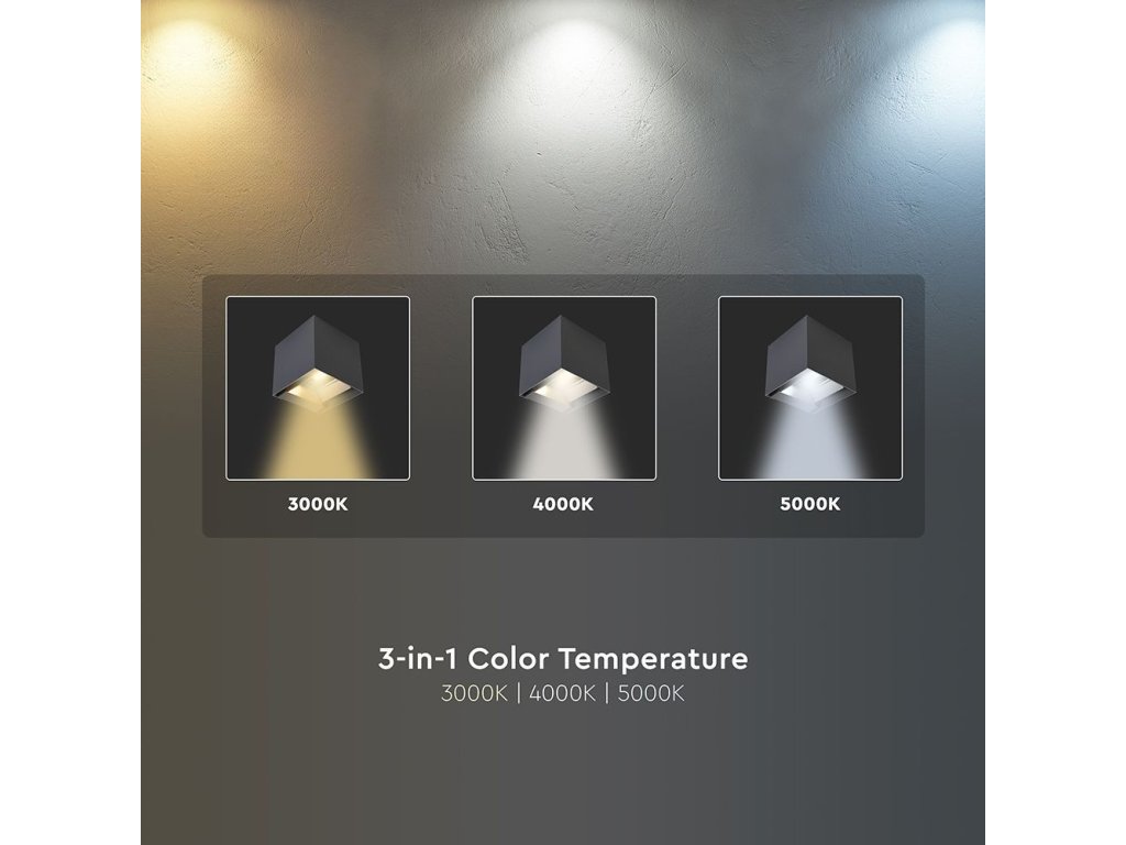 Tmavě šedé solární LED fasádní svítidlo s hranatým designem nabízí výkon 9W a kombinuje moderní vzhled s praktickou funkčností pro venkovní prostory. Díky integrovanému CCT DIP přepínači si lze přímo ve svítidle zvolit barvu světla – teplá (3000K), neutrální denní (4000K) nebo studená (5000K), takže osvětlení snadno přizpůsobíte atmosféře okolí i konkrétnímu použití..