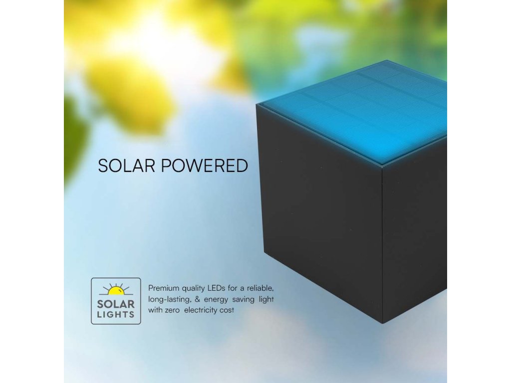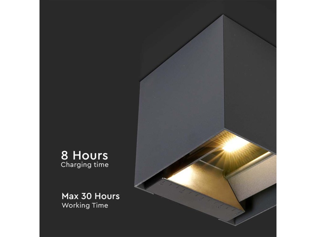 Svítidlo využívá monokrystalický solární panel o výkonu 3W, který napájí integrovanou baterii Li-Ion 3,7V 2600mAh. Ta dokáže zajistit provoz až 30 hodin na jedno nabití. Plné nabití proběhne přibližně za 8 hodin slunečního svitu. Konstrukce s krytím IP65 je odolná vůči dešti i prachu a svítidlo je tak vhodné pro dlouhodobé venkovní použití. LED čipy jsou skryté a neoslňují, takže světlo působí kompaktně a neruší vzhled fasády.