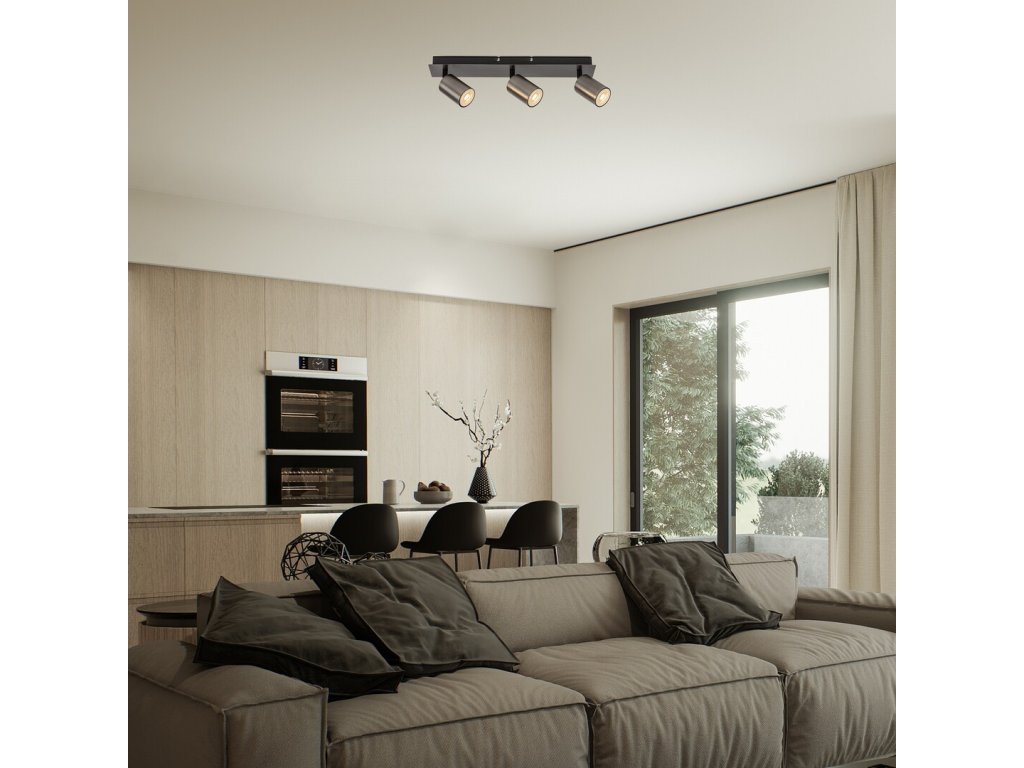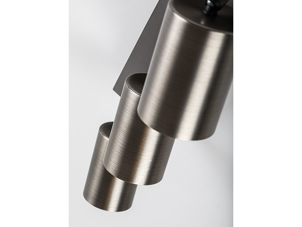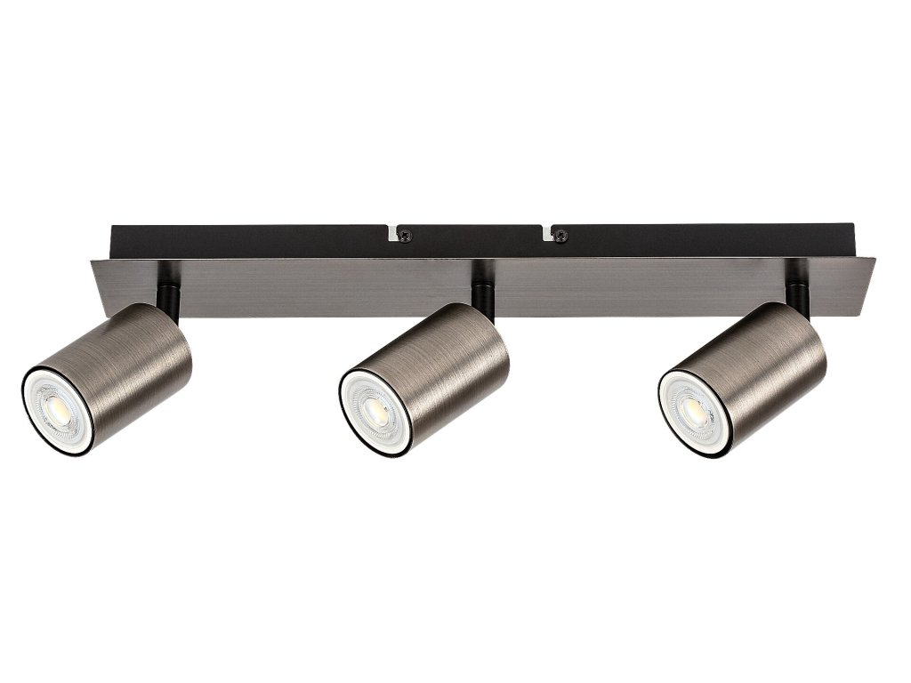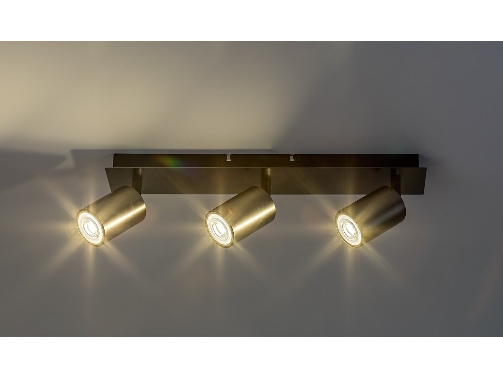 Svítidlo je upevněno ke stropu pomocí podlouhlé obdélníkové základny, na které jsou umístěny tři válcové, samostatně nastavitelné světelné hlavy. Díky možnosti jejich natáčení lze světlo přesně nasměrovat podle aktuálních potřeb prostoru, ať už pro celkové osvětlení místnosti nebo cílené nasvícení konkrétní plochy.