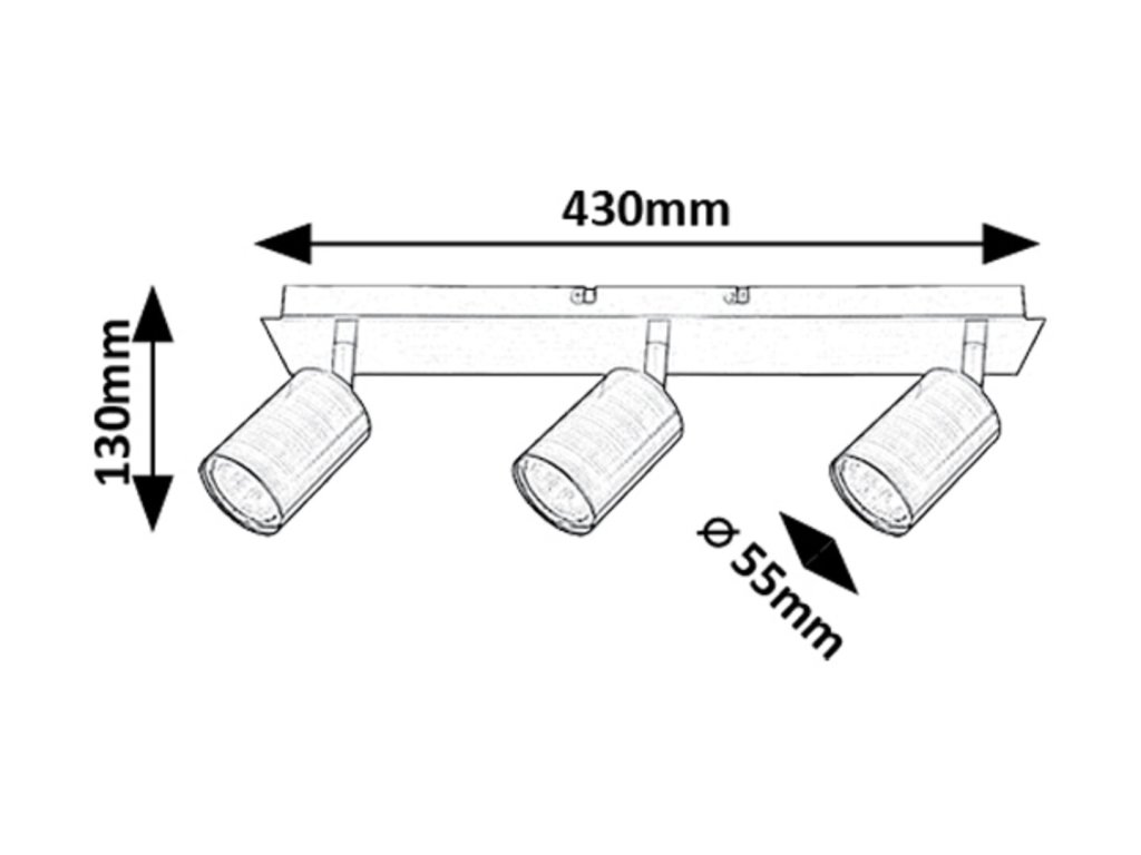 Celková šířka svítidla činí přibližně 430 mm, výška od stropu je 130 mm a průměr jednotlivých světelných hlav je 55 mm.