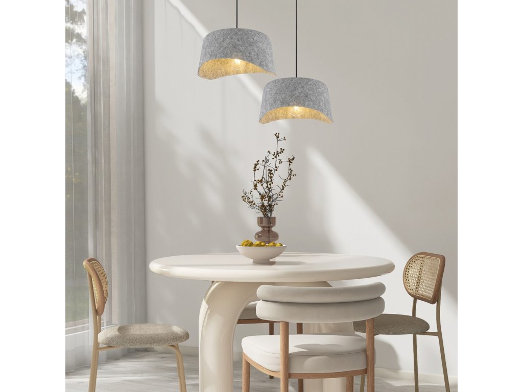 Závěsné svítidlo Farelia zaujme originálním tvarem a netradiční kombinací materiálů, díky které se stává výrazným, ale zároveň velmi příjemným prvkem interiéru. Spojení černé kovové konstrukce s šedými plstěnými stínidly působí moderně, útulně a přirozeně, což z tohoto svítidla činí ideální volbu pro ty, kteří hledají designové osvětlení s jemným a klidným charakterem.