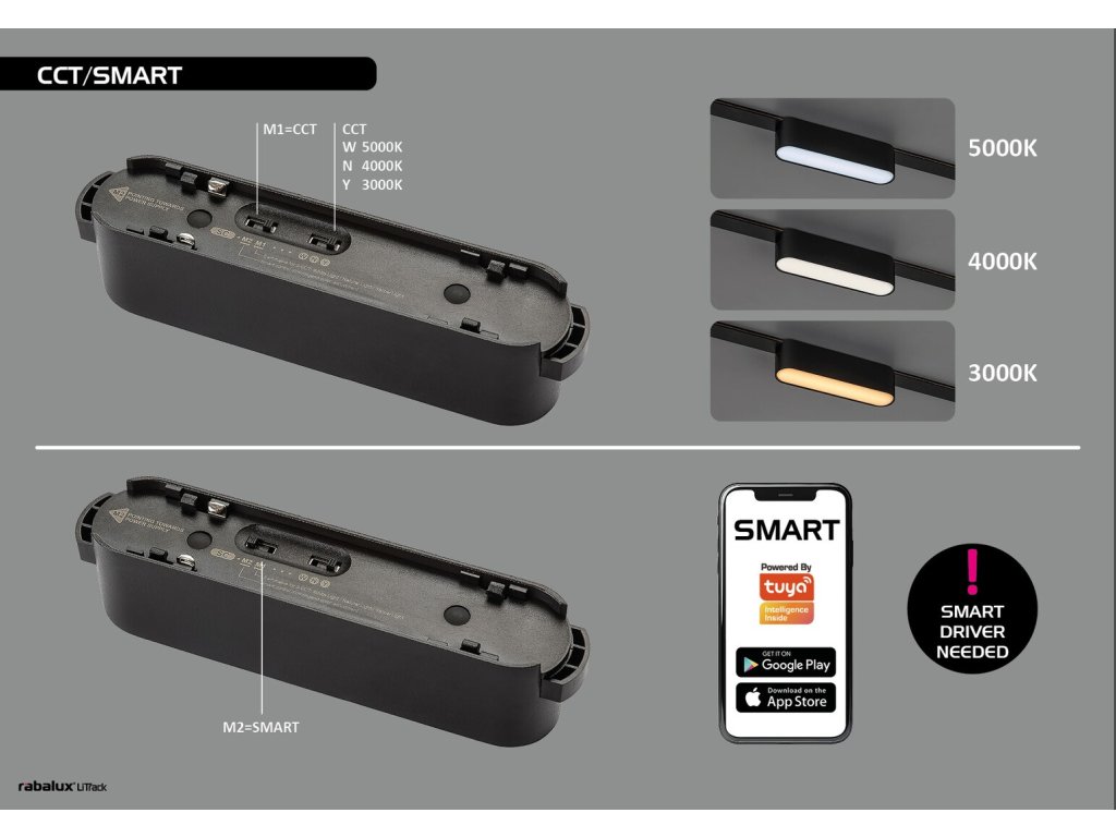 Unikátní vlastností tohoto svítidla je zabudovaný DIP přepínač, který umožňuje volbu mezi dvěma režimy ovládání. V prvním režimu lze svítidlo připojit přes WiFi a pohodlně ovládat pomocí aplikace TUYA. Díky aplikaci lze nejen nastavit barvu světla, ale také snadno regulovat intenzitu světla. Druhý režim (CCT) umožňuje manuální nastavení barvy světla prostřednictvím druhého DIP přepínače, kde lze zvolit mezi teplou bílou (3000 K), denní bílou (4000 K) a studenou bílou (5000 K).