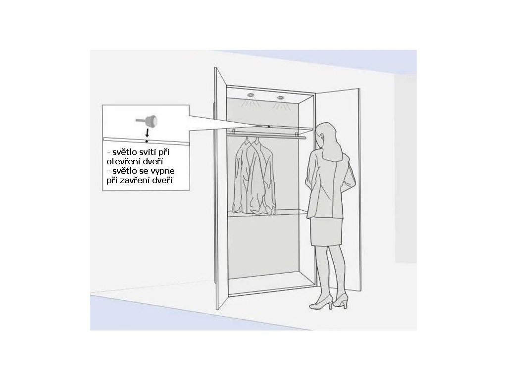 - Osvětlení ve skříních: Automaticky zapne světlo při otevření dvířek.