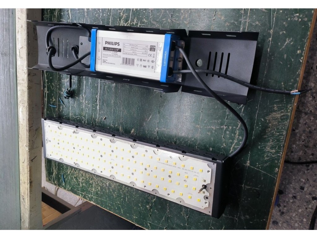 Součástí reflektoru jsou výkonné LED čipy SMD5050 zajišťující vysokou účinnost a dlouhodobě stabilní světelný výkon. Uvnitř svítidla jsou z výroby integrovány stmívatelné zdroje Philips 1–10 V, takže nejsou řešeny jako externí ani dodávané samostatně. Zdroje jsou umístěné v robustních kovových krytech, jak je vidět na montážním snímku, které se starají o stabilní provoz svítidla, bezpečné vedení kabeláže, vysoký faktor výkonu i plynulou regulaci intenzity světla.