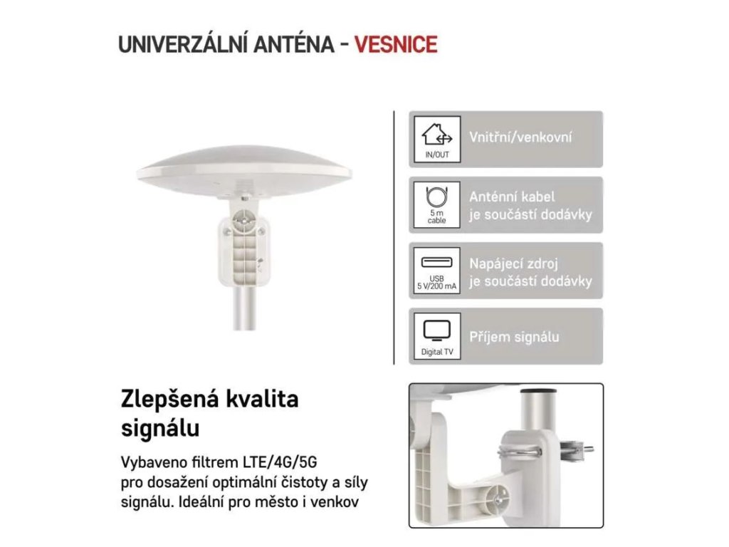 Anténa je určena do oblastí s kvalitním signálem, typicky pro vesnickou zástavbu, a zvládne příjem signálu z vysílačů vzdálených až 80 km. Díky kruhovému příjmu v rozsahu 360° nemusíte anténu přesně směrovat, což značně zjednodušuje její instalaci. Tu zvládnete snadno a rychle, protože vše potřebné – včetně držáku, 5m anténního kabelu a USB napájecího adaptéru – je součástí balení.