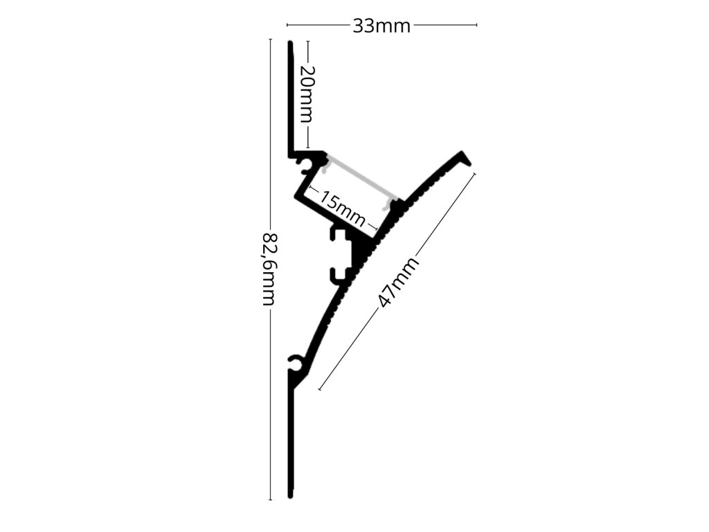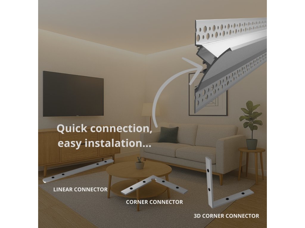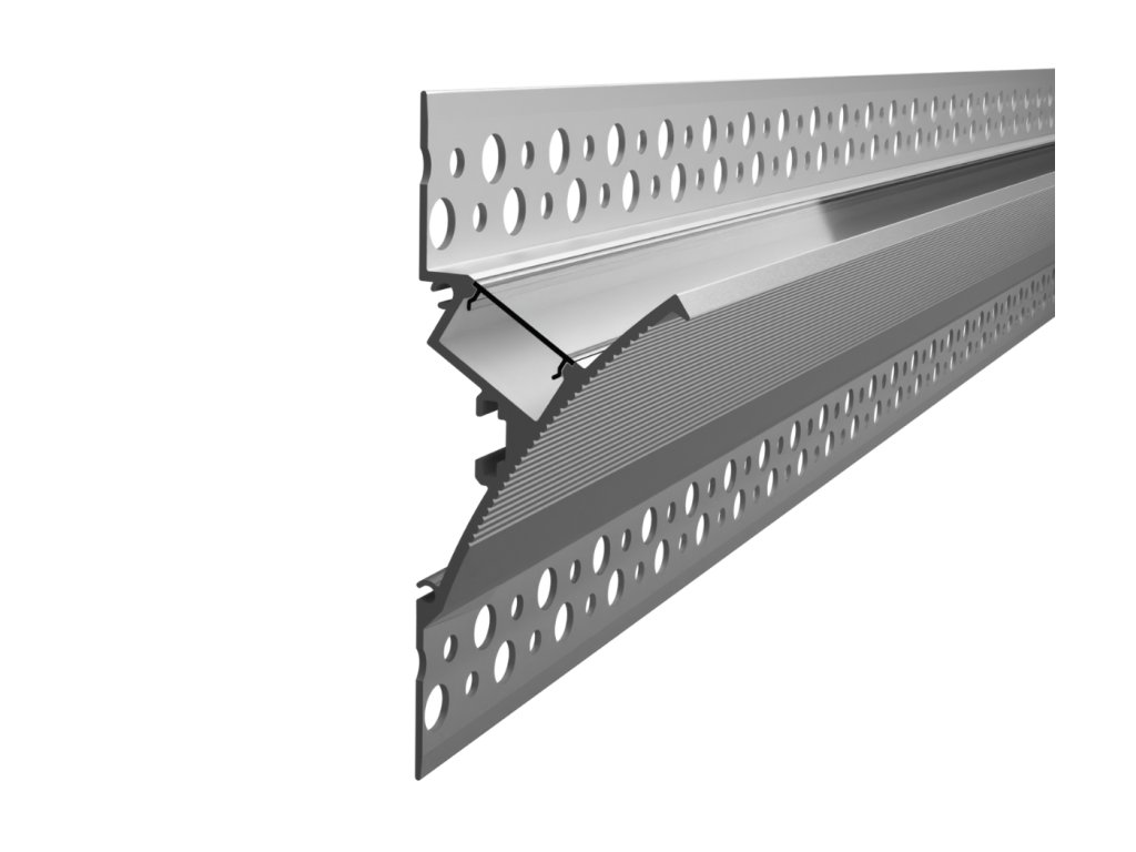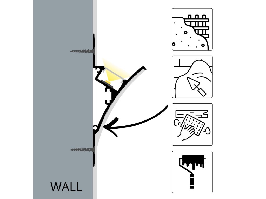 Profil je navržen pro zapuštěnou montáž do SDK konstrukcí, kde je určen k úplnému začlenění do povrchu stěny nebo stropu. Nejprve se mechanicky upevní, čímž je zajištěno přesné usazení a stabilní instalace. Následně se profil vyztuží síťovinou a zatmelí tak, aby vznikl plynulý přechod mezi profilem a okolním povrchem. Po vytvrdnutí se povrch přebrousí do hladkého finálního stavu a v závěrečném kroku se natře tak, aby profil vizuálně splynul s okolní plochou. Výsledkem je čisté architektonické řešení, při kterém zůstává viditelný pouze jemný efekt nepřímého osvětlení.