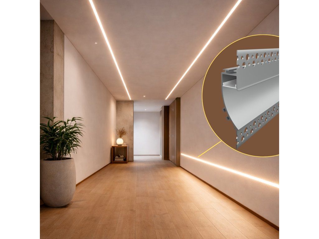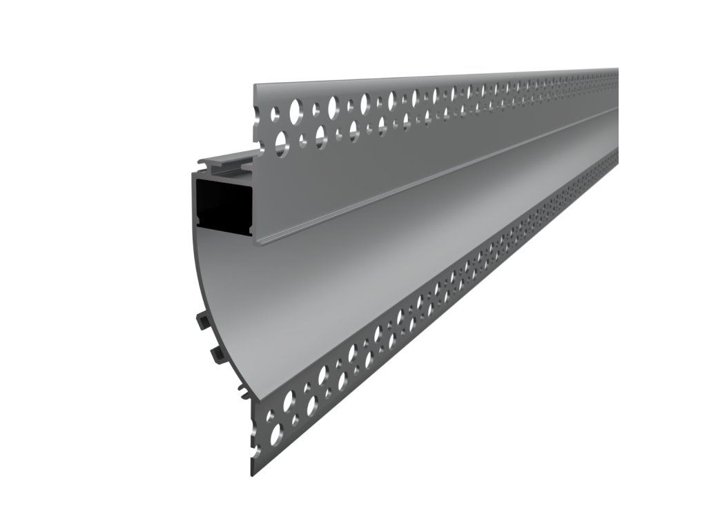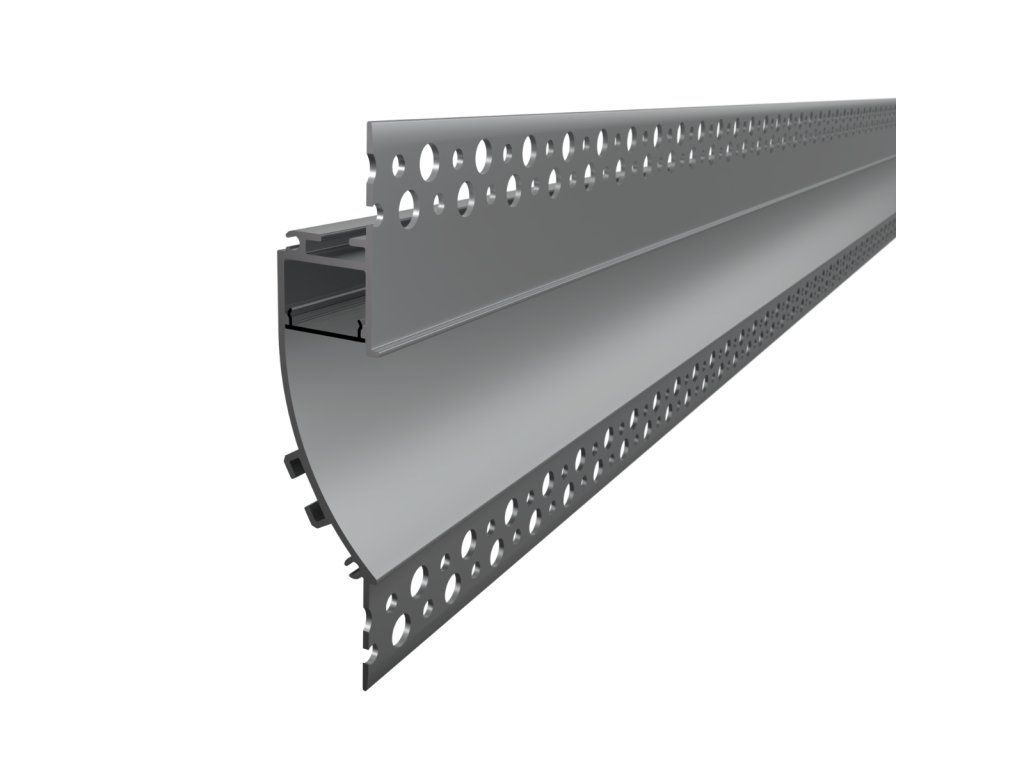 Vestavný hliníkový profil slouží jako účinný chladič pro LED pásek a zároveň jako nenápadný architektonický prvek, který umožňuje vytvářet čisté a souvislé linie osvětlení. Po instalaci je profil plně integrován do stěny nebo stropu, takže v interiéru zůstává viditelný pouze samotný světelný efekt bez rušivých hran nebo viditelného zdroje světla. Díky zaoblenému zapuštěnému tvaru navíc vytváří měkký a plynulý přechod světla do prostoru.