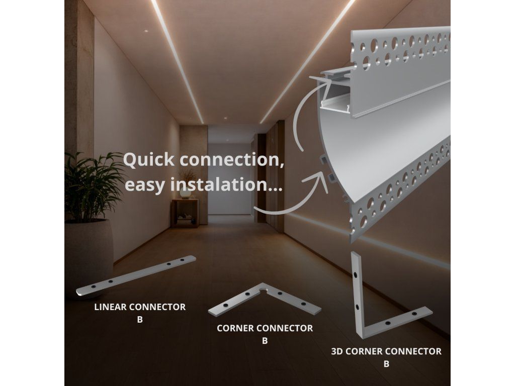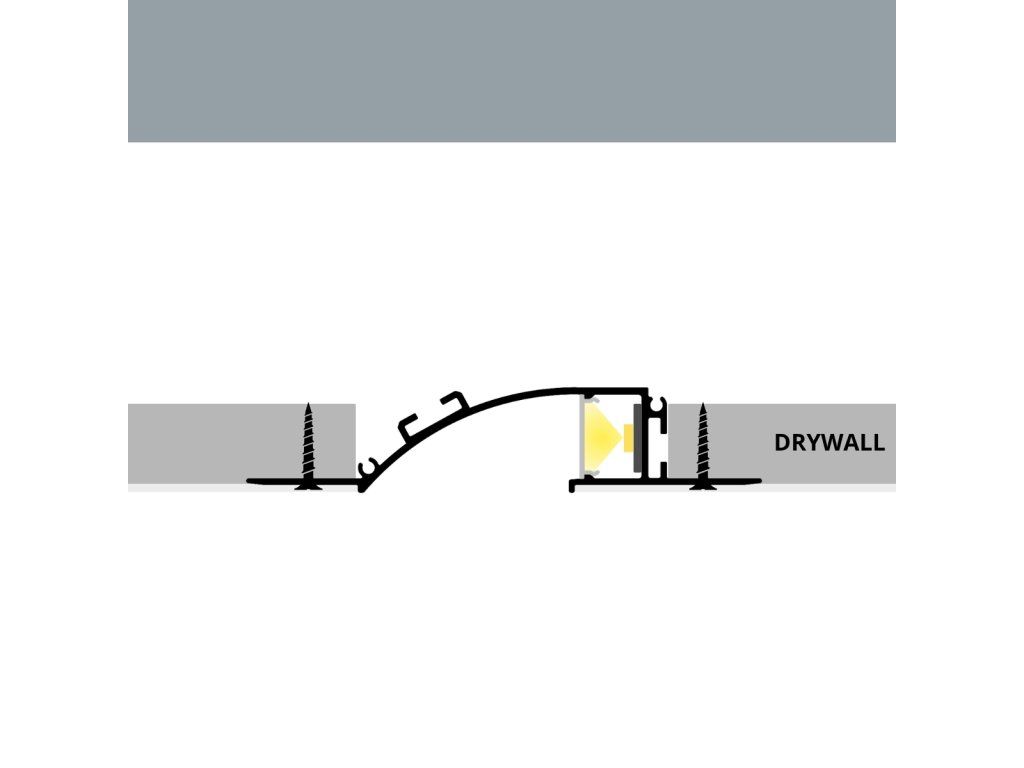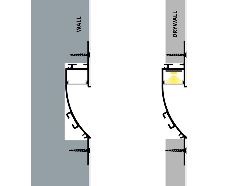 Profil je navržen pro zapuštěnou montáž do předem připravené drážky ve stěně nebo stropu. Nejprve se mechanicky upevní, čímž je zajištěno přesné usazení a stabilní instalace. Perforované hrany umožňují vyztužení pomocí síťoviny a následné zapracování do omítky, stěrky nebo sádrokartonové konstrukce. Po vytvrdnutí se povrch přebrousí do hladkého finálního stavu a v závěrečném kroku se natře tak, aby profil vizuálně splynul s okolní plochou. Výsledkem je čisté architektonické řešení, při kterém zůstává viditelná pouze jemná světelná linie.