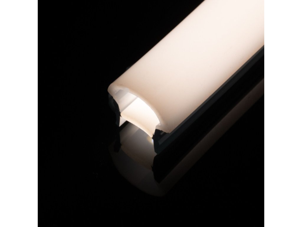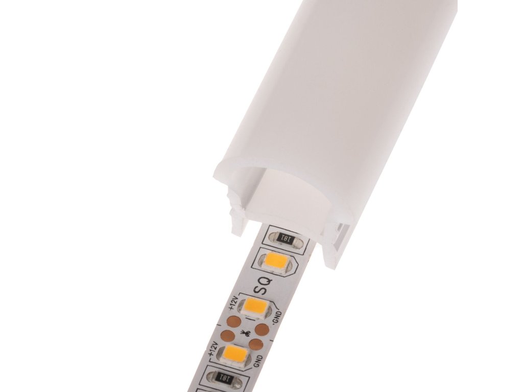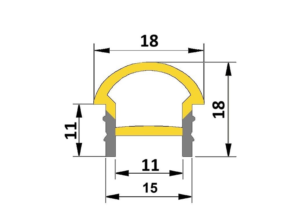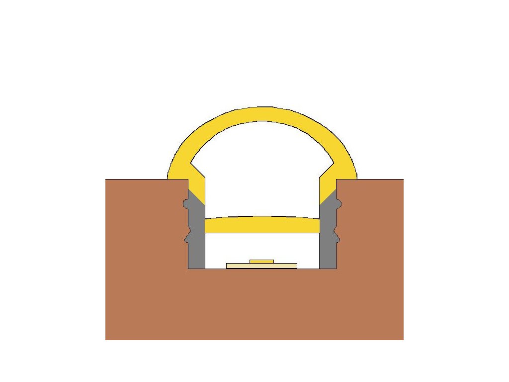 Vestavný kulatý silikonový profil je určený pro vestavnou instalaci s LED pásky. Profil se instaluje do vyfrézované drážky a kulatá část je umístěná nad povrch drážky. Na silikonovém profilu svítí žlutá část na nákresu, který naleznete v galerii. Díky mléčnému silikonu LED pásky poté svítí v rukávu celistvě a nejsou viditelné celé samotné diody.