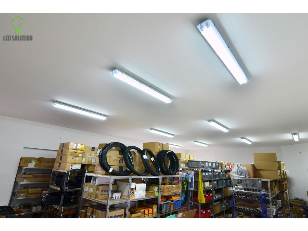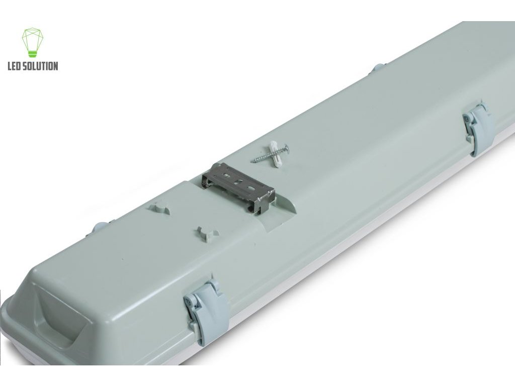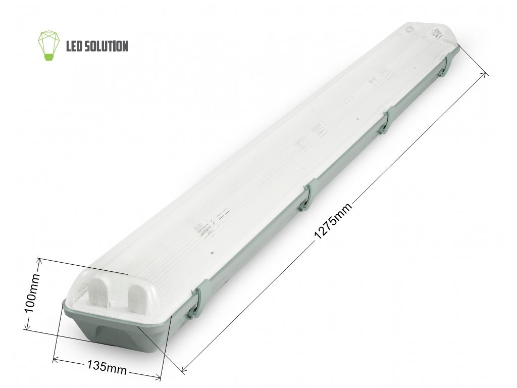 Těleso je určeno pro dvě LED trubice 120 cm a poskytuje voděodolnost i prachotěsnost díky krytí IP65, takže celá souprava nabízí spolehlivé a úsporné osvětlení pro běžné provozy i náročnější podmínky.