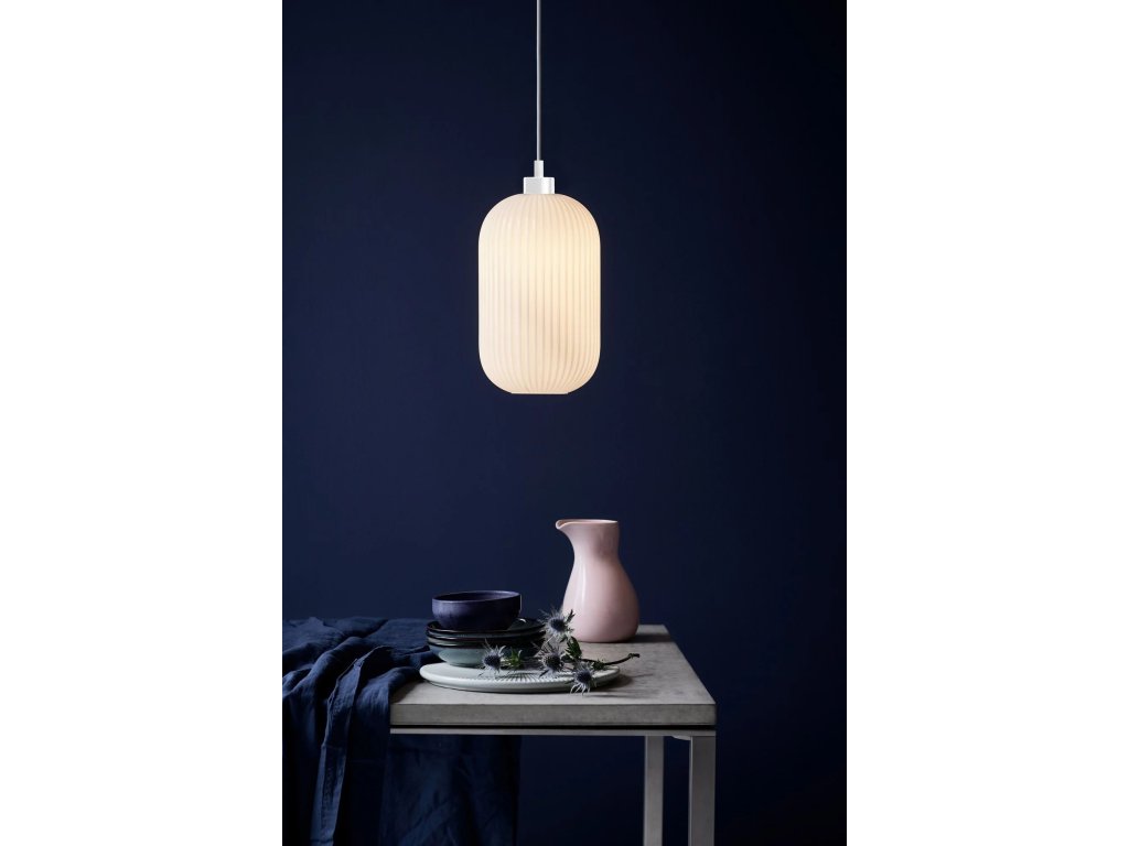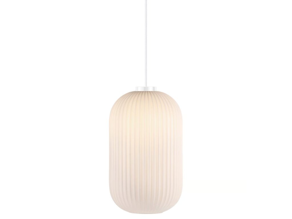 Závěsný lustr Milford vyniká elegantním stínidlem z opálově bílého, ručně foukaného skla, jehož jemně rýhovaný povrch dodává svítidlu výjimečný charakter. Organický tvar v kombinaci s polotransparentní strukturou zajišťuje měkké, rovnoměrné osvětlení, které vytváří příjemnou a útulnou atmosféru v interiéru.