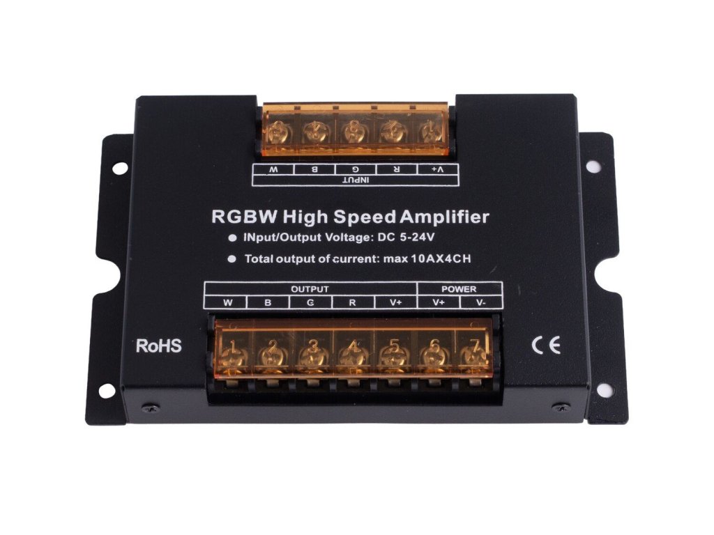 Zesilovač čtyřkanálový RGBW signálu RGBW LED produktů. Slouží k rozšíření výkonů LED ovladačů nad jejich přípustné zatížení.
