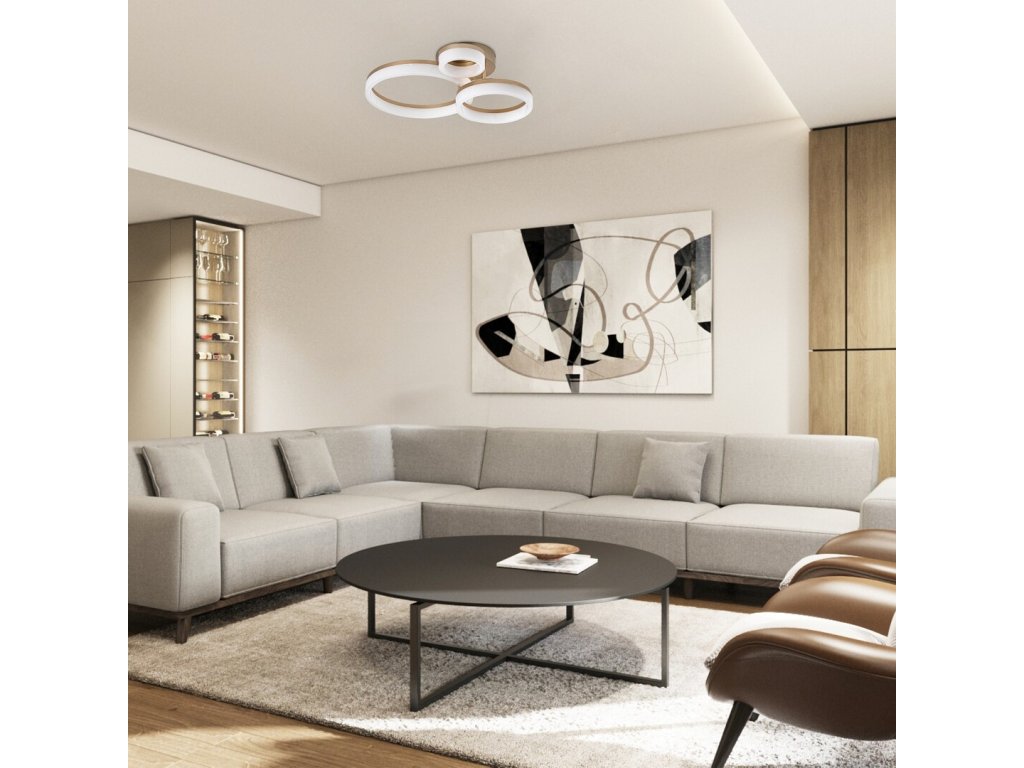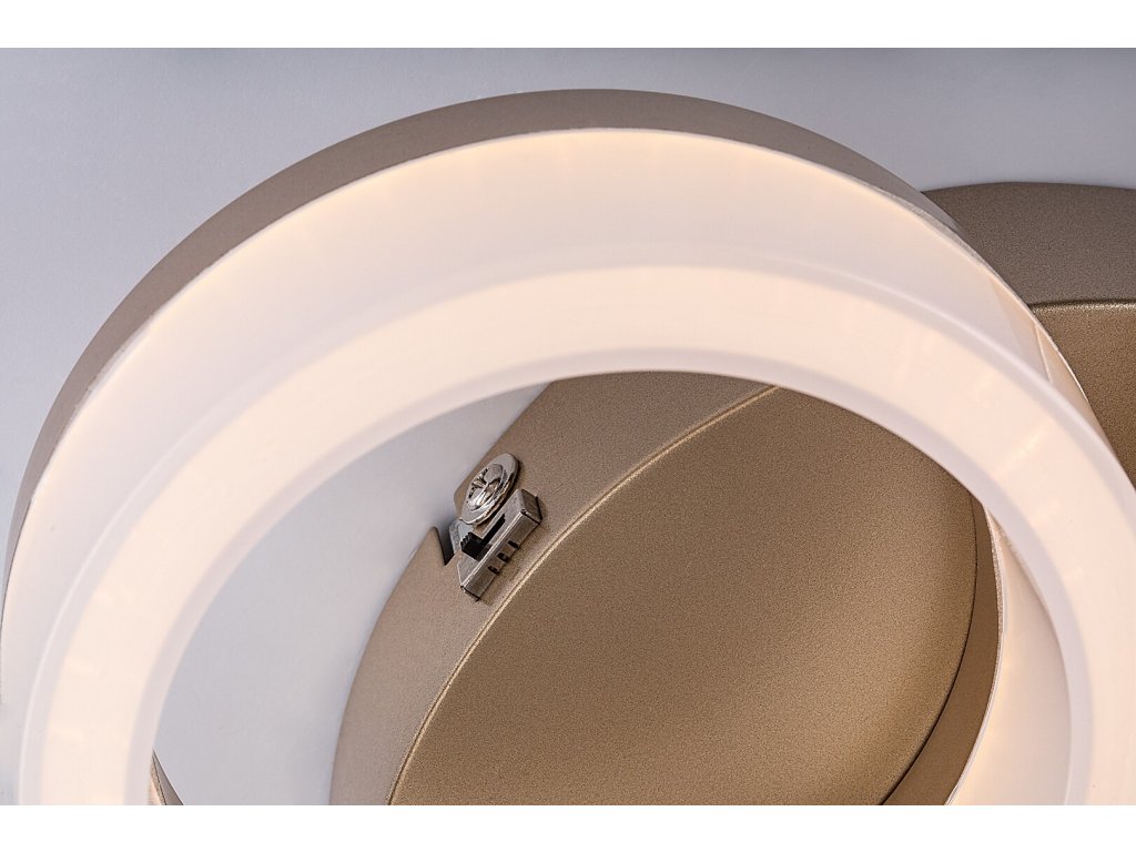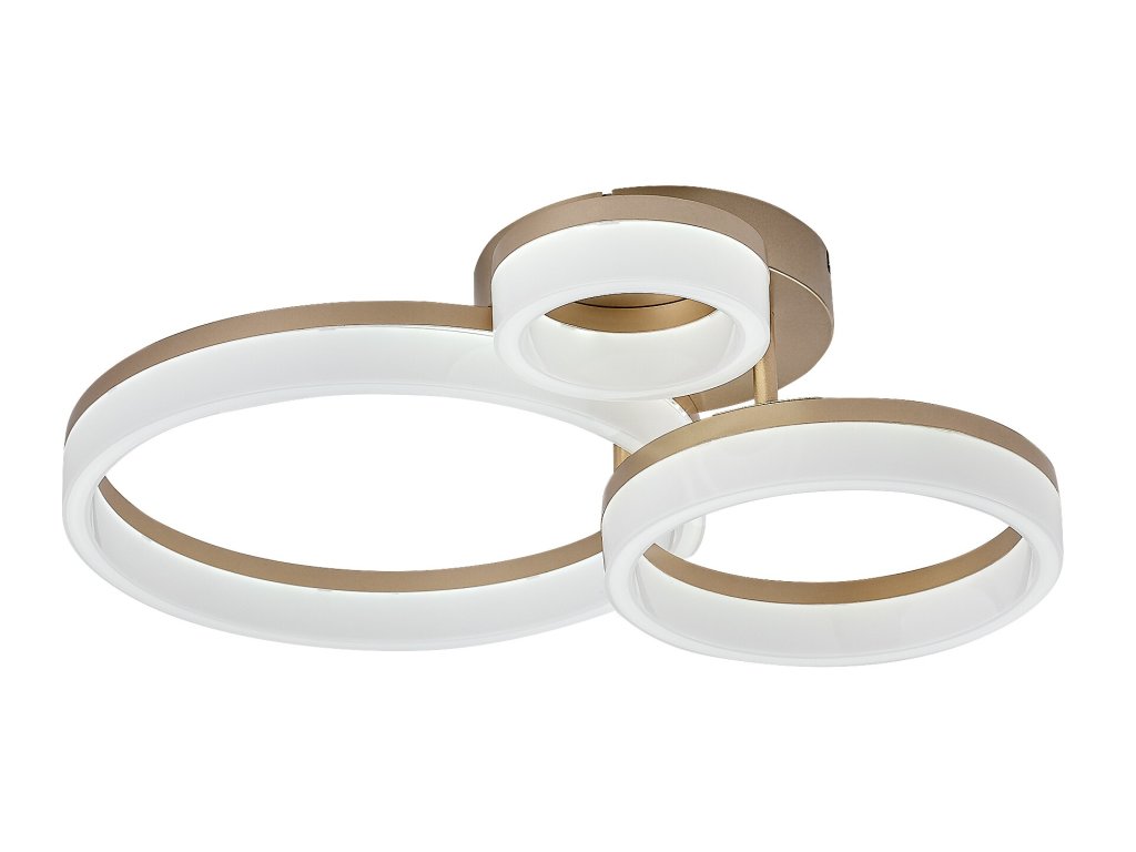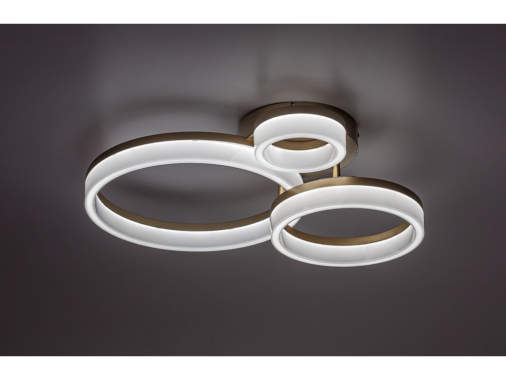 Stropní svítidlo Amilia zaujme elegantním a moderním designem, který se stane výrazným prvkem každého současného interiéru. Konstrukce svítidla je tvořena třemi vzájemně propojenými kruhovými prvky různých velikostí, které vytvářejí harmonickou a zároveň dynamickou kompozici. Kovové tělo ve zlatém provedení působí luxusně a je doplněno bílým plastovým stínidlem, jež zajišťuje rovnoměrné rozptýlení světla bez oslnění. Díky svému vzhledu je svítidlo ideální volbou do obývacího pokoje, jídelny nebo ložnice, kde nabídne nejen kvalitní osvětlení, ale i estetický zážitek.