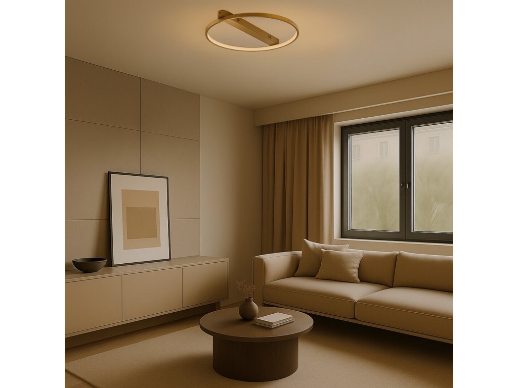 Stropní svítidlo Beliza ve zlatém provedení zaujme elegantním moderním designem v podobě jemného kruhu, který působí luxusně a zároveň čistě. Kovové tělo v teplém zlatém odstínu dodává interiéru sofistikovaný akcent a v kombinaci s bílým silikonovým stínidlem umístěným po vnitřním obvodu kruhu vytváří příjemné, rovnoměrně rozptýlené světlo bez oslnění. Prodloužená dekorační stropní základna se zaoblenými konci přispívá k harmonickému vzhledu a elegantnímu uchycení ke stropu.