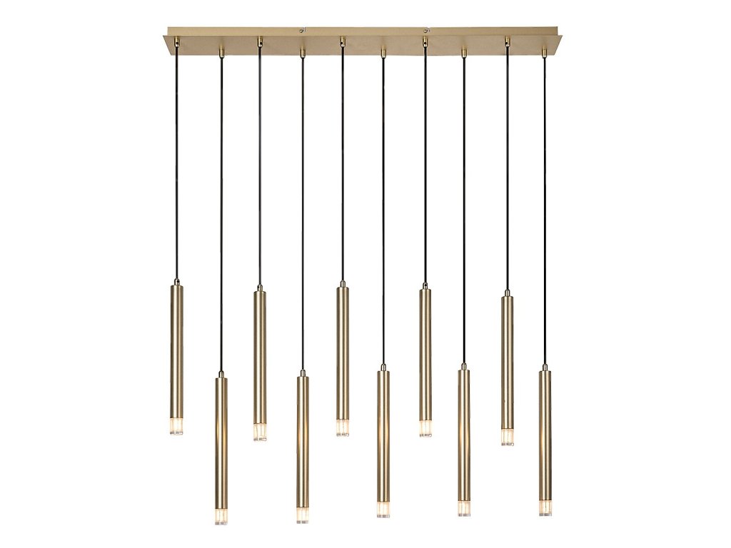 Kovové provedení ve zlaté barvě dodává svítidlu elegantní a sofistikovaný vzhled, který vynikne v moderních i nadčasově laděných interiérech. Každý válcový světelný prvek je zakončen průhledným akrylovým stínidlem, které zajišťuje přímé a koncentrované vyzařování světla směrem dolů. Díky malému průměru závěsů působí svítidlo subtilně i při vyšším počtu světelných bodů a zachovává si lehký, vzdušný charakter.