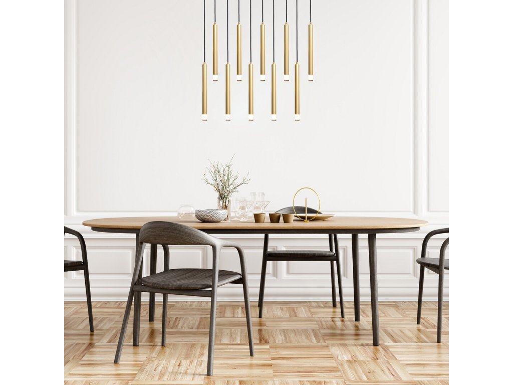 Svítidlo je uchyceno ke stropu pomocí dlouhé čtvercové dekorativní základny ve stejném zlatém odstínu, která sjednocuje celou sestavu a umožňuje rovnoměrné rozmístění jednotlivých závěsů. Tento typ provedení se výborně hodí nad jídelní stůl, kuchyňský ostrůvek, pracovní plochu nebo do otevřených obytných prostor, kde vytvoří výrazný, ale stále čistý světelný prvek. Výšku jednotlivých závěsů lze při instalaci individuálně upravit podle dispozice místnosti.
